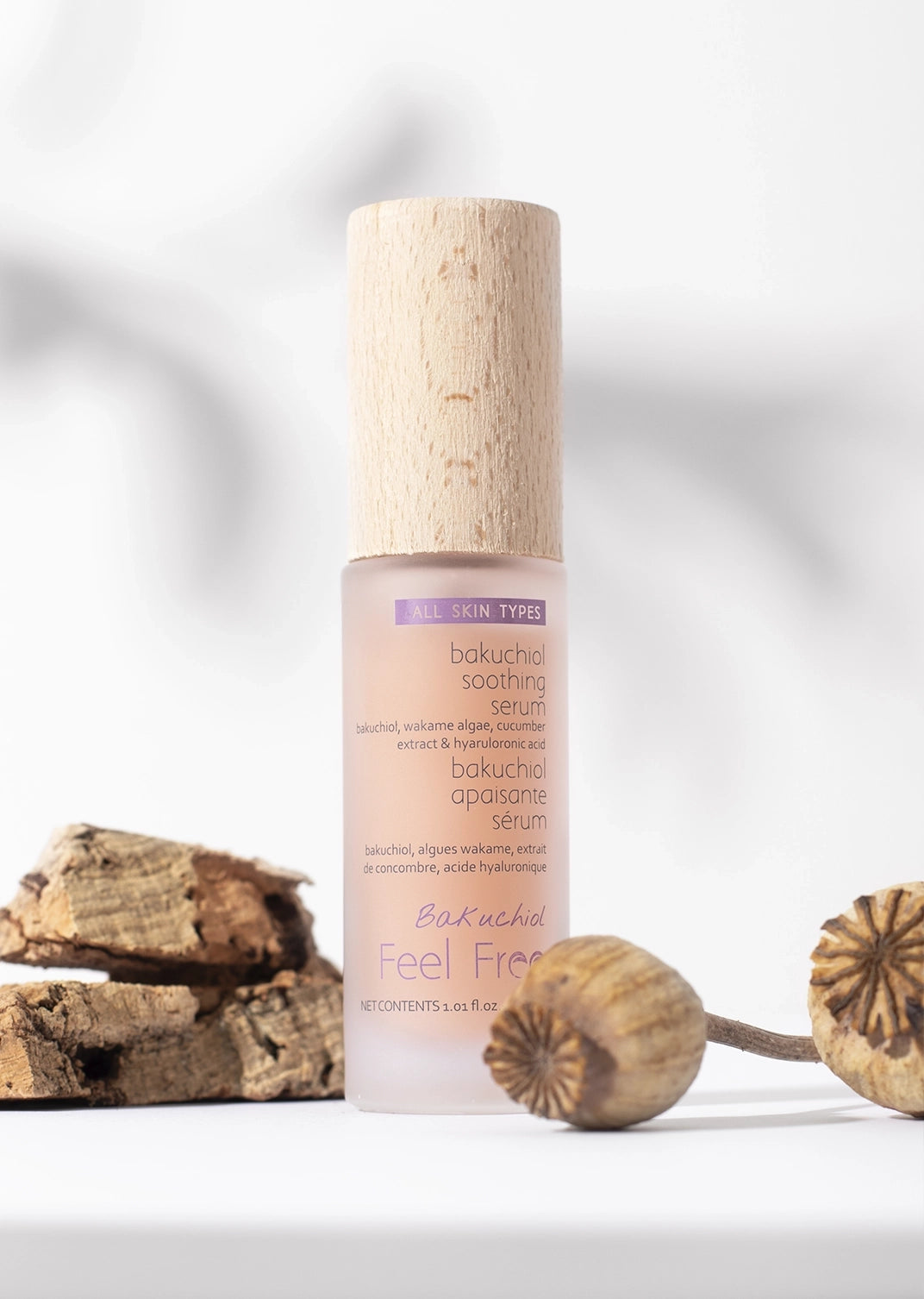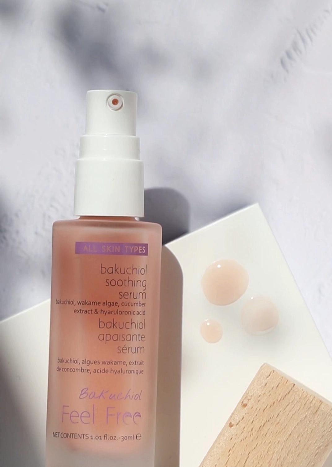 გააცოცხლეთ თქვენი კანი ჩვენი ბაკუჩიოლის სახის შრატით (30მლ) Feel Free. ის ბაკუჩიოლისა და ვაკამეს ექსტრაქტის წყალობით ანიჭებს კანს ახალგაზრდულ და მნათ იერს. მისი გამაცოცხლებელი კიტრის ექსტრაქტი ხსნის შეშუპებას და ასწორებს ნაოჭებსა და წვრილ ხაზებს, ტოვებს კანს ახალსა და ნათელს.